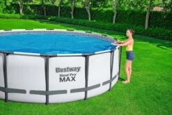 Keep water and heat in and debris, leaves, and trash out of your pool with this Flowclearâ„¢ Solar Pool Cover. Above ground swimming solar pool covers create a greenhouse effect in your pool. Solar covers also prevent water evaporation caused by dry winds, or free-chlorine loss caused by UV rays. These covers are designed to keep water and heat in, but debris out. Extend your swimming season with a Bestway® Solar Pool Cover. Fits 12’/3.66m Fast Setâ„¢ and Steel Proâ„¢ Pools.